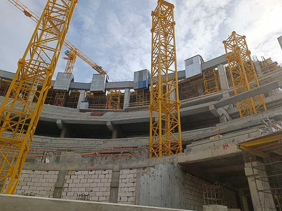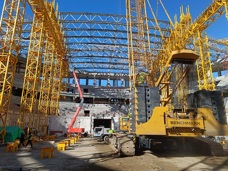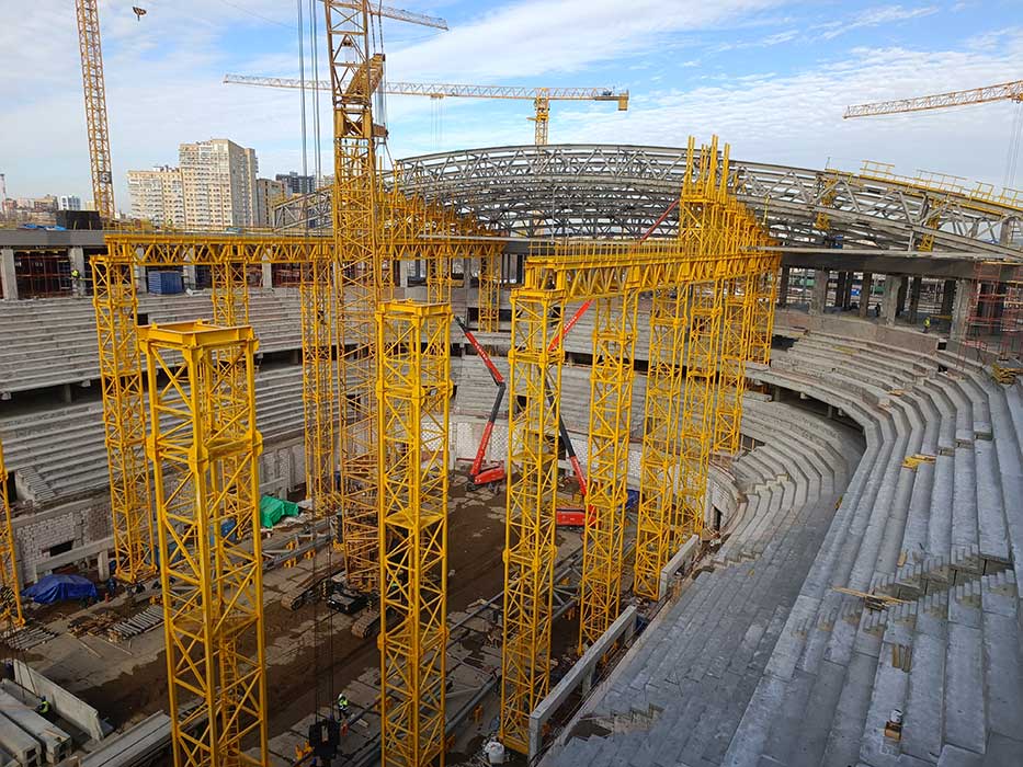 Монтаж несущих металлоконструкций покрытия трибун 1.600 тонн,